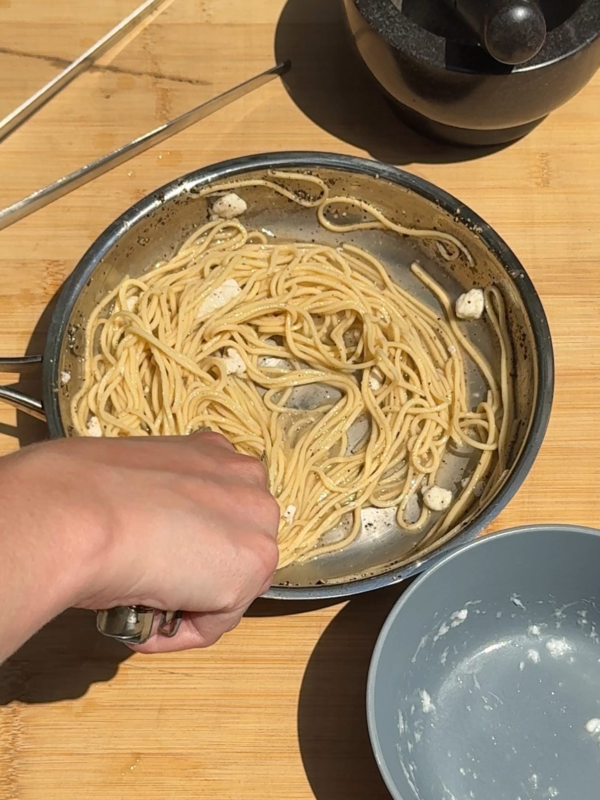 Prep all your ingredients before you start, including making your pasta, grating your cheese and finally crushing your black peppercorns with your mortar and pestle.