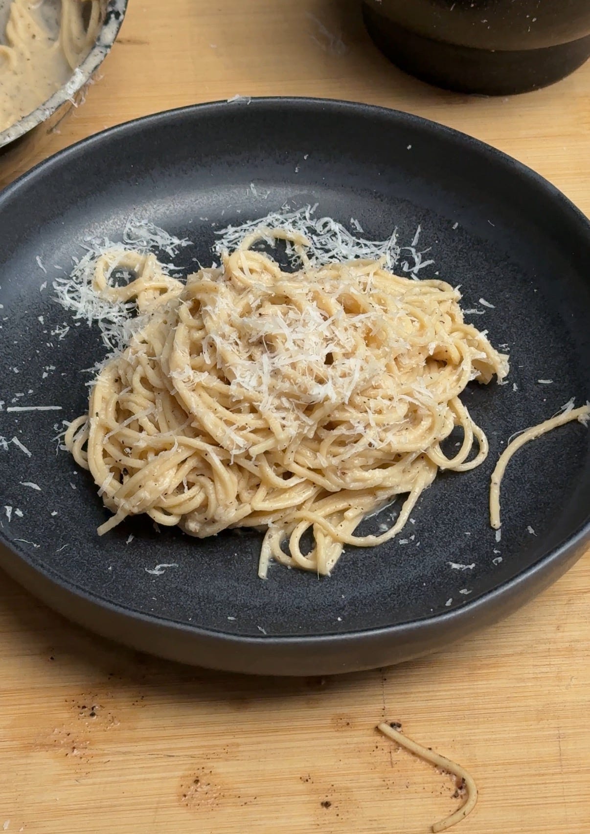 Alas, I corrected course, removed the clumps of cheese, took the pasta off the heat and added more cheese until I did have a beautiful creamy cacio e pepe.
