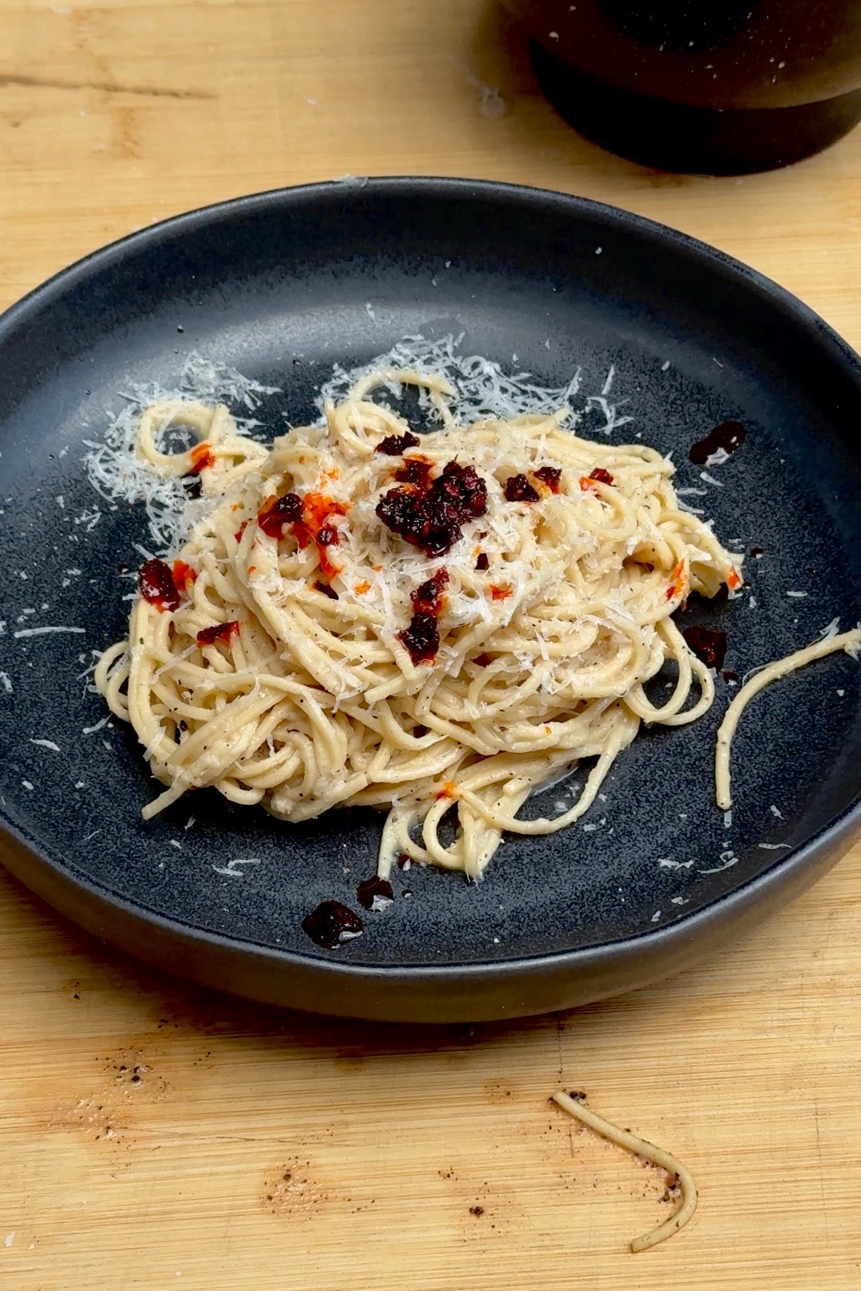 Cacio e pepe with crispy chilli oil (serves two)